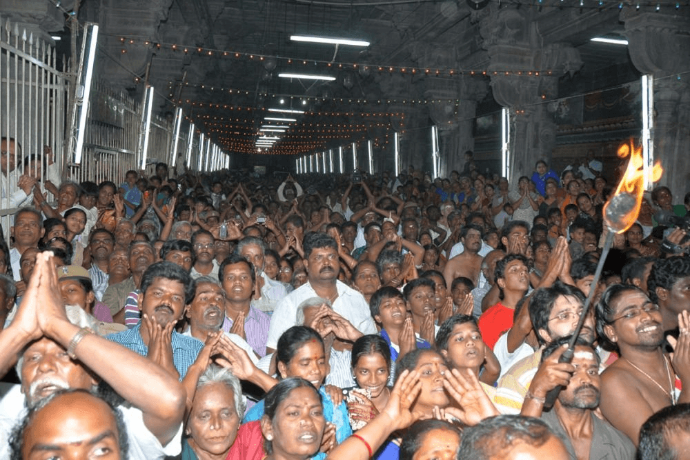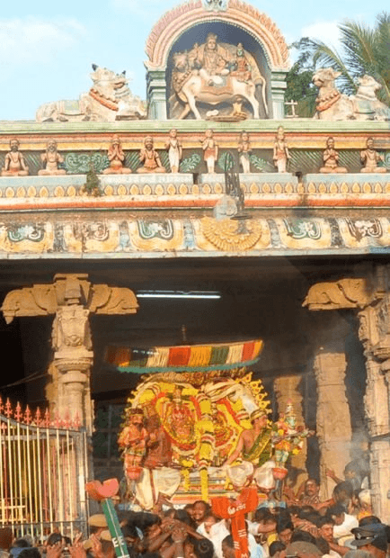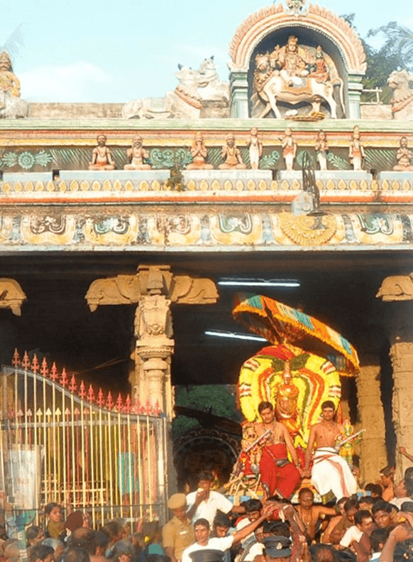 On blessing the Sun at the thitti vaasal the procession goes around the temple perimeter thrice. During which the actual staging of the Divine Quarrel is re-enacted on the streets; the first time as Brahma, second as Vishnu and the third round as Rudra.