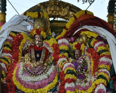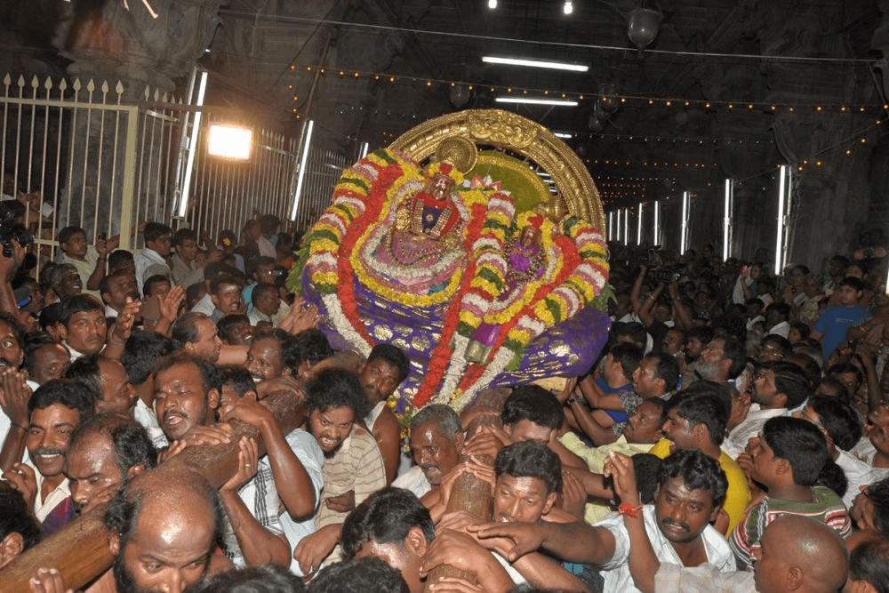 From the early hours Abishekam is performed at the Temple to start the procession by 5 a.m. At which time an iconic representation of the Lord (and Parvati) is carried by attendants on a palanquin with a huge sunshade.