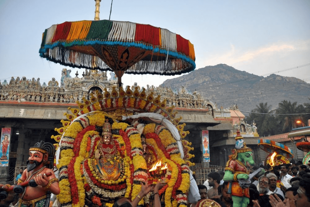 The palanquin first visits the Kodi Kampathu Nandi and gives darshan as Viratswarupa and afterwards separates into three parts representing; Brahma, Siva and Vishnu before leaving the compound of Arunachaleswarar.
