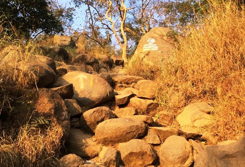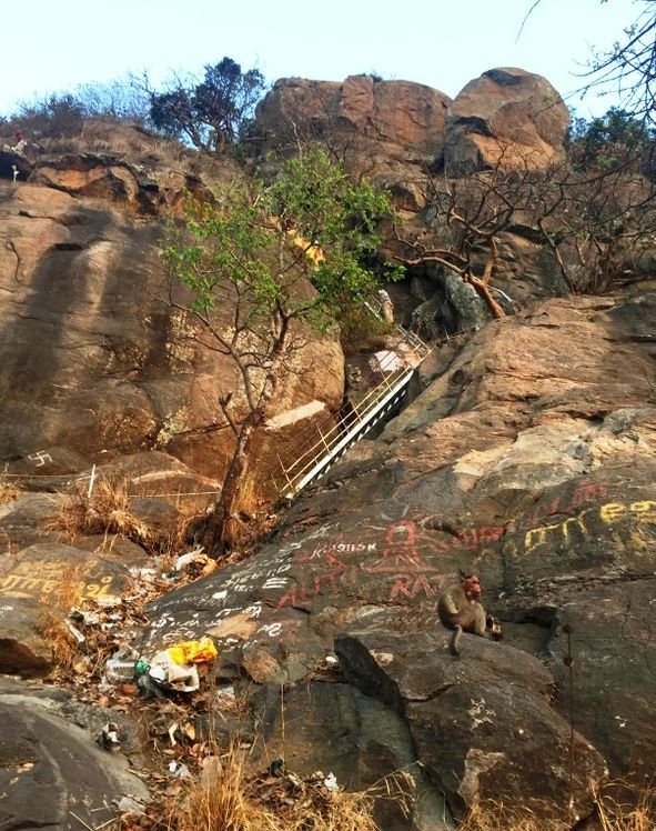 The route to the top of the Hill is marked by white arrow markers painted on the rocks. Both the Kadaladi and Thenmadhimangalam routes cover about 60% of the distance to the summit with the two paths joining before the handrails. There are some small shops and vendors at the early part of the climb where the Kadaladi trek pathway meets with the Thenmadhimangalam route.