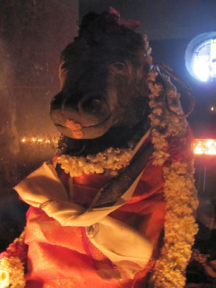 Swamigal arrived at the Big Temple and after worshipping Lord Arunachala, sprinkled holy water from his kamandalu onto the cow and the creature immediately returned to life. The hitherto distressed calf became happy and jumped towards its mother to have milk. The king was shocked to see such happenings and fell to the ground, worshipping Swamigal in remorse for his actions. The king most eager to see the full extent of the spiritual powers of the saint, requested Swamigal to bring to life a stone bull (Nandi) in the Temple. Swamigal said that it would happen and recited the Linga mantra. As he was chanting the Nandi came to life, stood up and made a loud sound and then sat back down and became stone again.